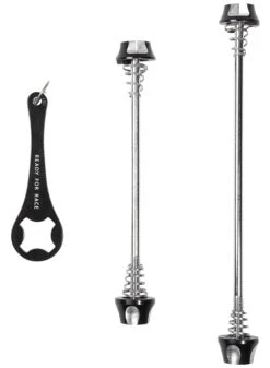 Spezielle Spannachsen, die vor dem Diebstahl deiner Laufräder schützen. Die Einbaumaße für das Hinterrad betragen 165/170 mm, für das Vorderrad 100/110 mm.