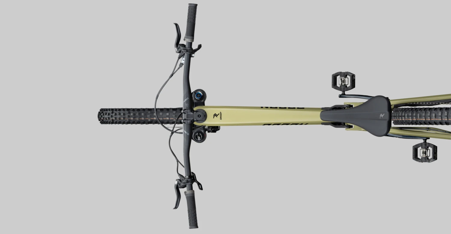 Die Vorgaben bei der Entwicklung fĂĽr das SWOOP in der Carbonvariante waren klar – frisches Design, moderne Kinematik und neue Dämpferanlenkung. Da ist kein Stein ist auf dem alten geblieben. Dennoch haben wir die DNA des beliebten SWOOP AL in Teilen beibehalten – progressive Geometrie, 29″ Laufräder, Möglichkeit der Geometrieverstellung, 170mm Federweg – hier wurden keine Kompromisse eingegangen. Die Kinematik des SWOOP ist progressiv ausgelegt, auch Coil Dämpfer passen gut zur Charakteristik des Bikes. FĂĽr eine hohe Wendigkeit konnten wir die Kettenstreben mit 438mm kurz halten, trotz des langen Radstands und der flachen Winkel sind enge Kurven kein Hindernis. Anstatt eines Flip Chips fĂĽr die Geometrieanpassung haben wir den Steuersatz verstellbar gestaltet, so sind die Schalen mit Winkeln versehen und können gedreht werden, um den Steuerwinkel um 1,5 Grad zu variieren.